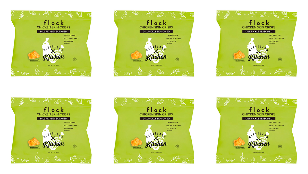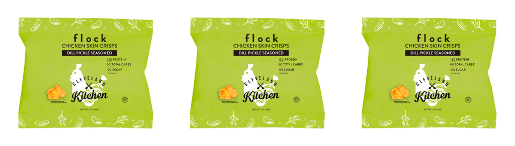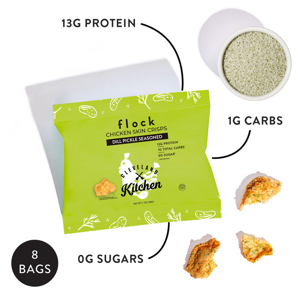 After plenty of crunch-filled taste tests (a tough job, we know), we found the perfect balance of savory, salty, and dill-icious. The result? Flock x Cleveland Kitchen Dill Pickle Chicken Skin Crisps — a crispy, craveable crisp with the signature zing of real pickles and the hearty crunch of our seasoned chicken skins.