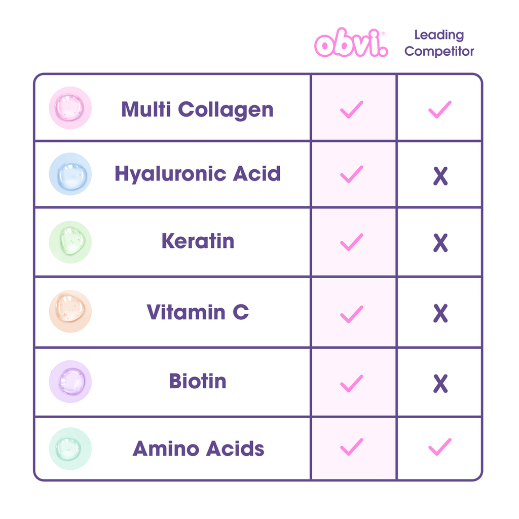 SugarNourish your body with Obvi's all natural formula enriched with Multi-Collagen, Keratin, Hyaluronic Acid, Vitamin C, and Biotin.