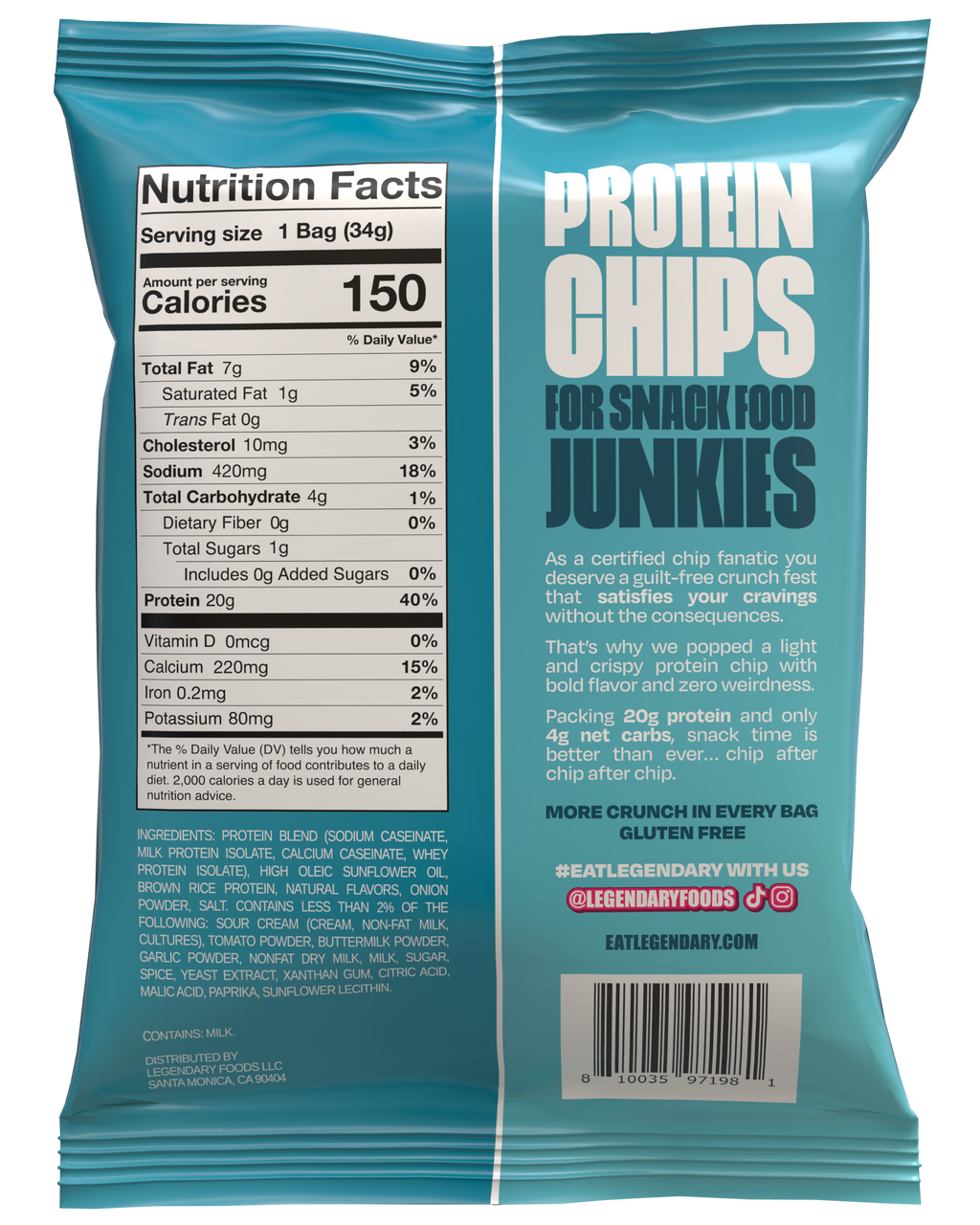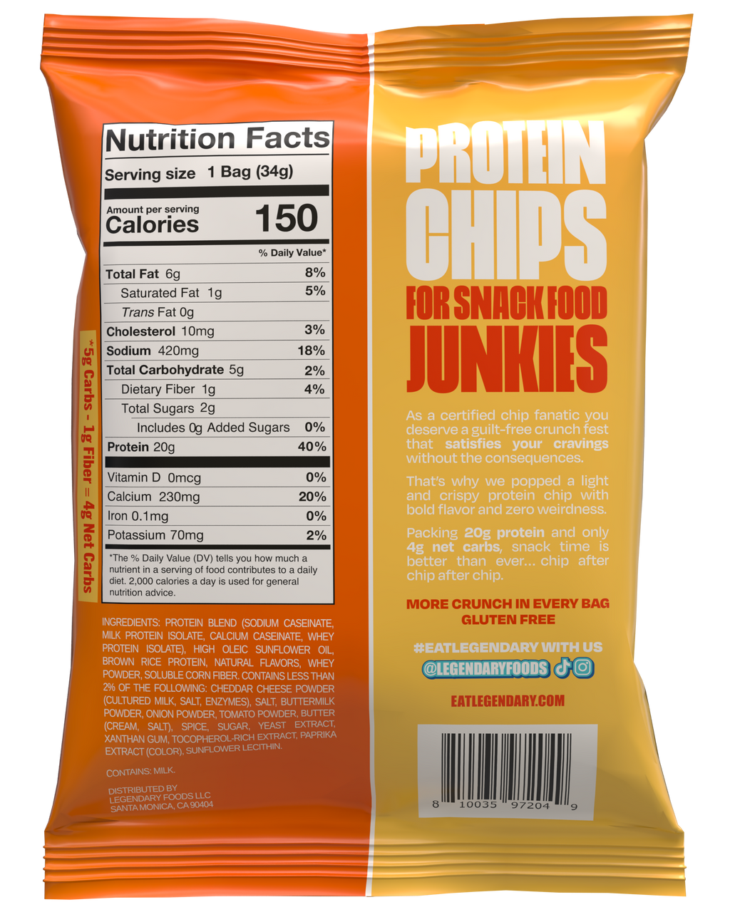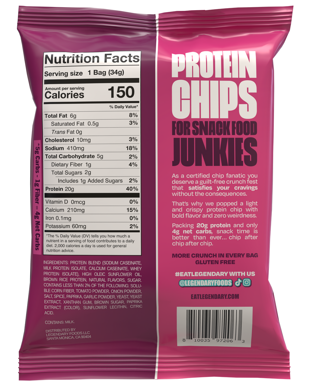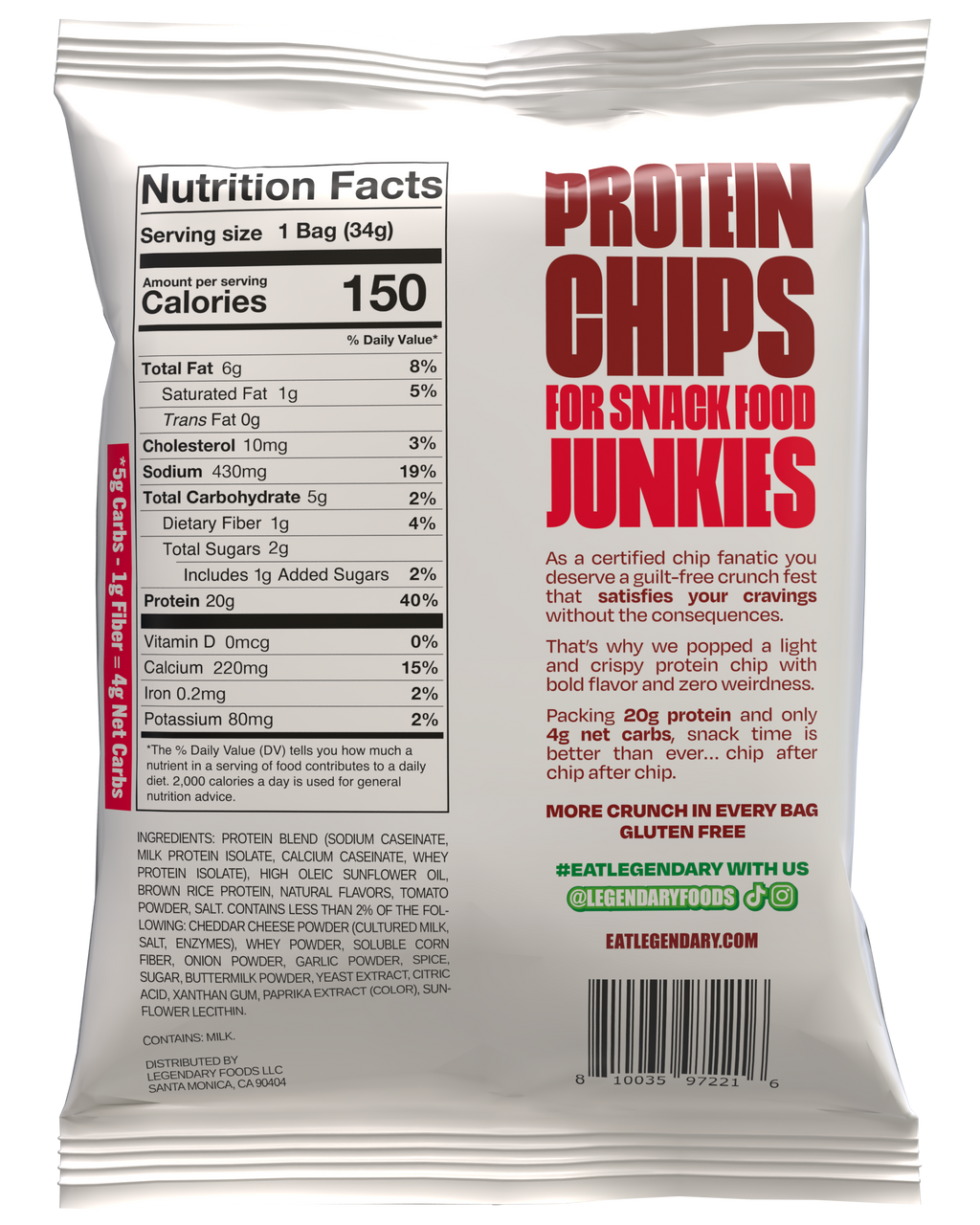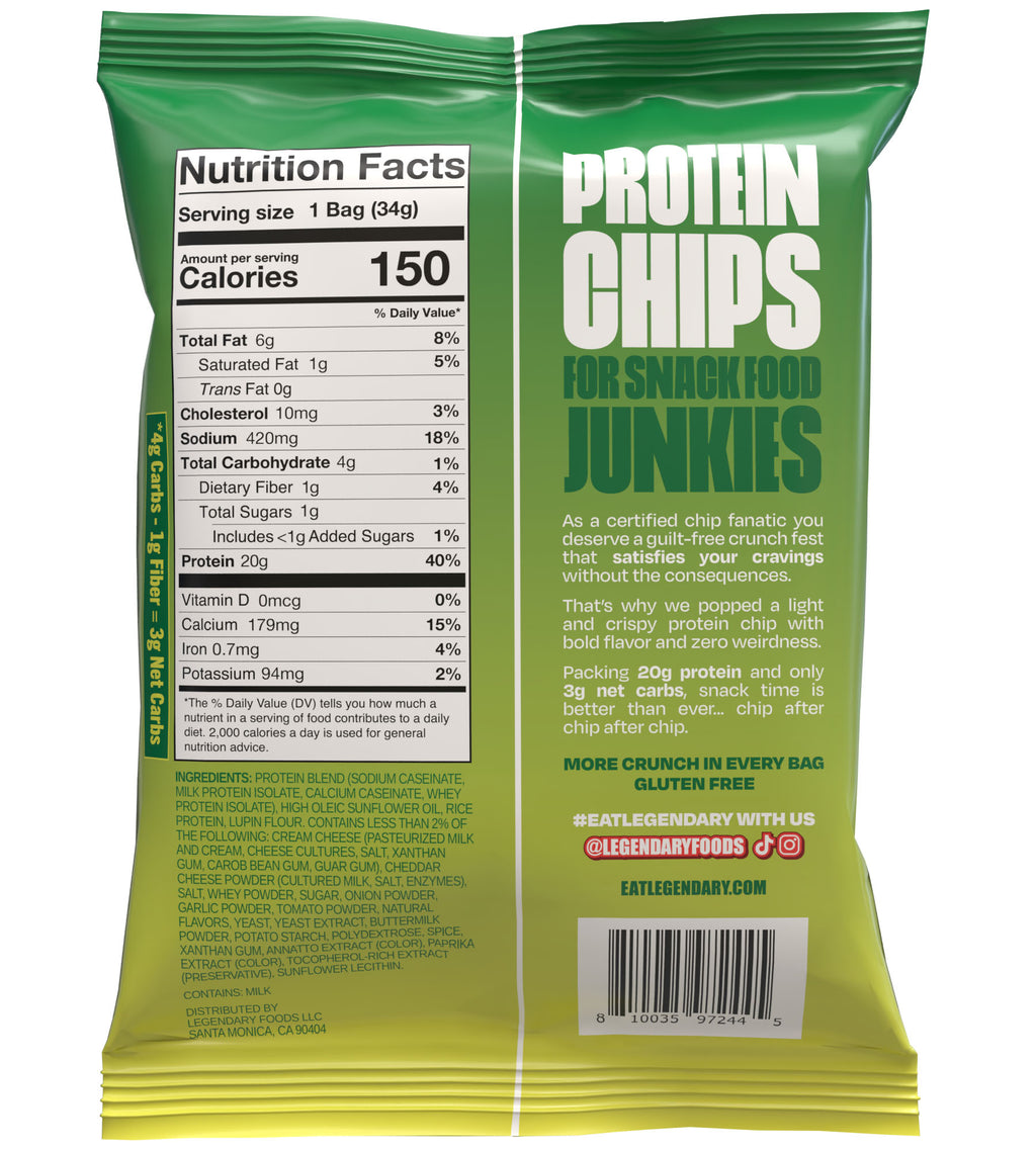As a snack fan and protein lover, Popped Protein Chips from Legendary Foods are the perfect companion for your next meal. With 20g of protein per bag, it's so easy to stay on track with a tasty crunchy snack that satisfies your hunger. Made with only 4g net carbs and just 2g sugar or less per bag, this fantastic snack is equally satisfying when you need something light or full of protein. Legendary Foods' new chip line will satisfy all snacking needs - including after dinner cravings!