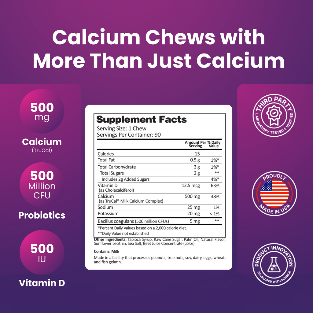 - 500mg Calcium, 500 IU Vitamin D3, 500 million CFU’s probiotics per chew