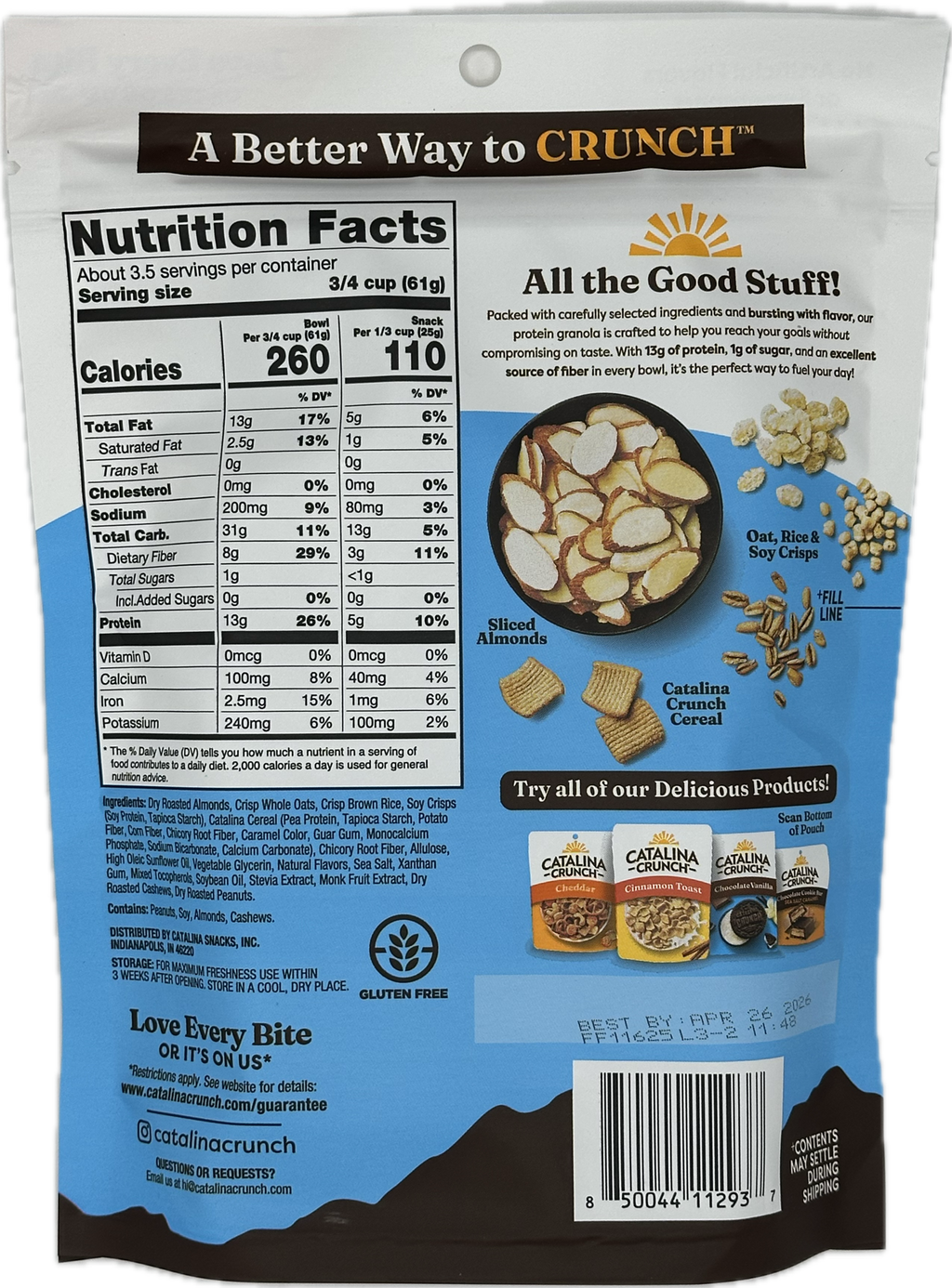 Versatile and Delicious: Catalina Crunch Protein Granola is more than just a breakfast cereal. It's a versatile option for anyone seeking a healthy, flavorful start to their day. Enjoy it with milk or yogurt, add it to your smoothie bowls, or snack on it right from the box for a crunchy treat.