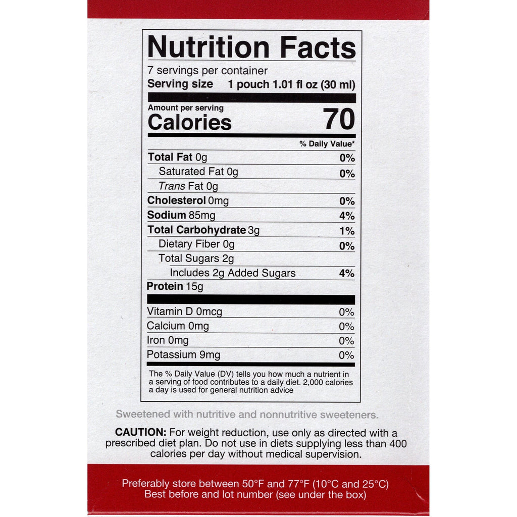 SugarThe Proti Diet Tropical Fruits liquid concentrate has only 60 calories, zero fat and 15 grams of protein per serving. This delightful Tropical Fruits flavored protein diet drink comes in easy-to-open liquid packets that you simply pour into a glass or bottle of cold water give it a shake and enjoy!