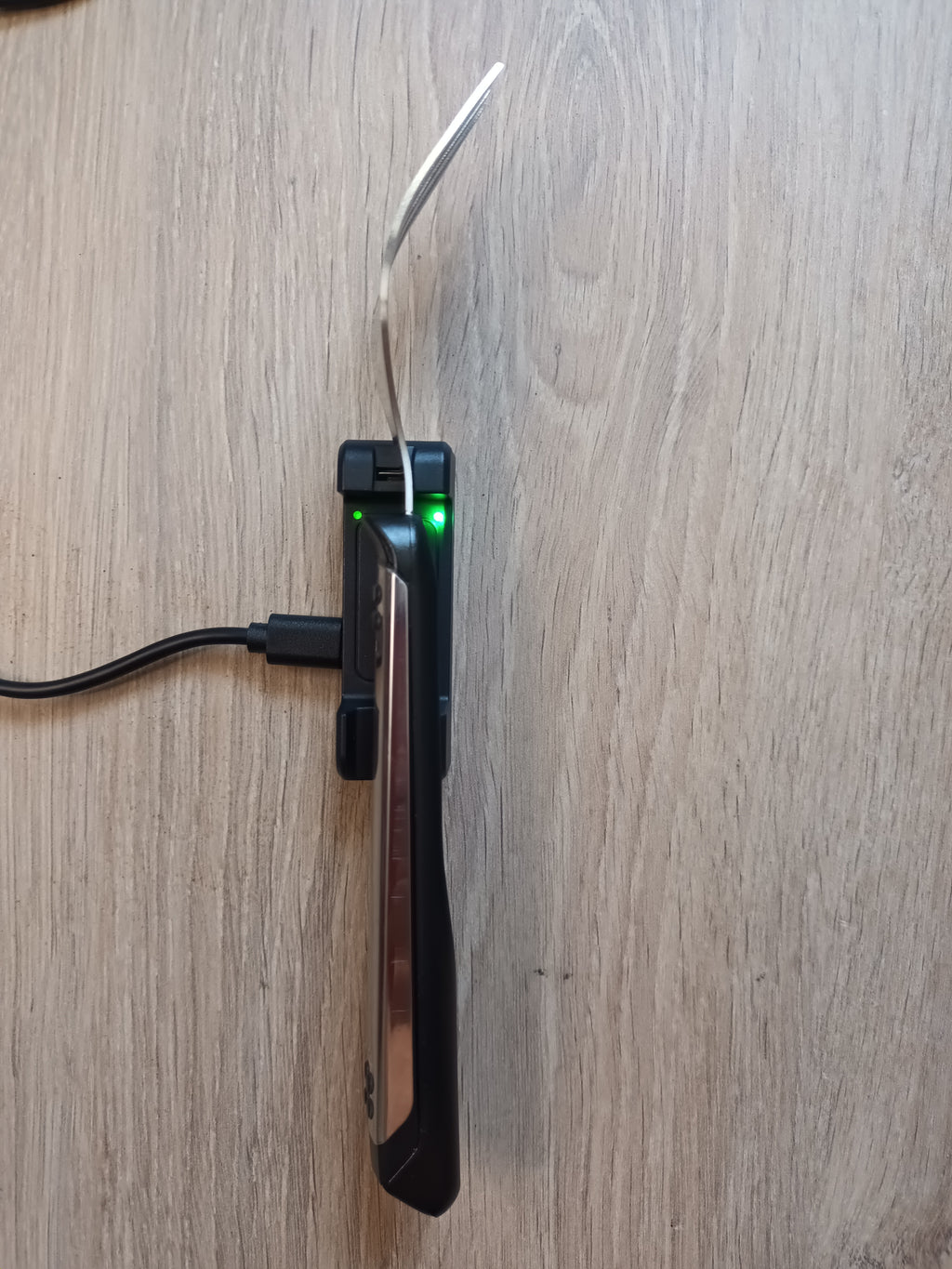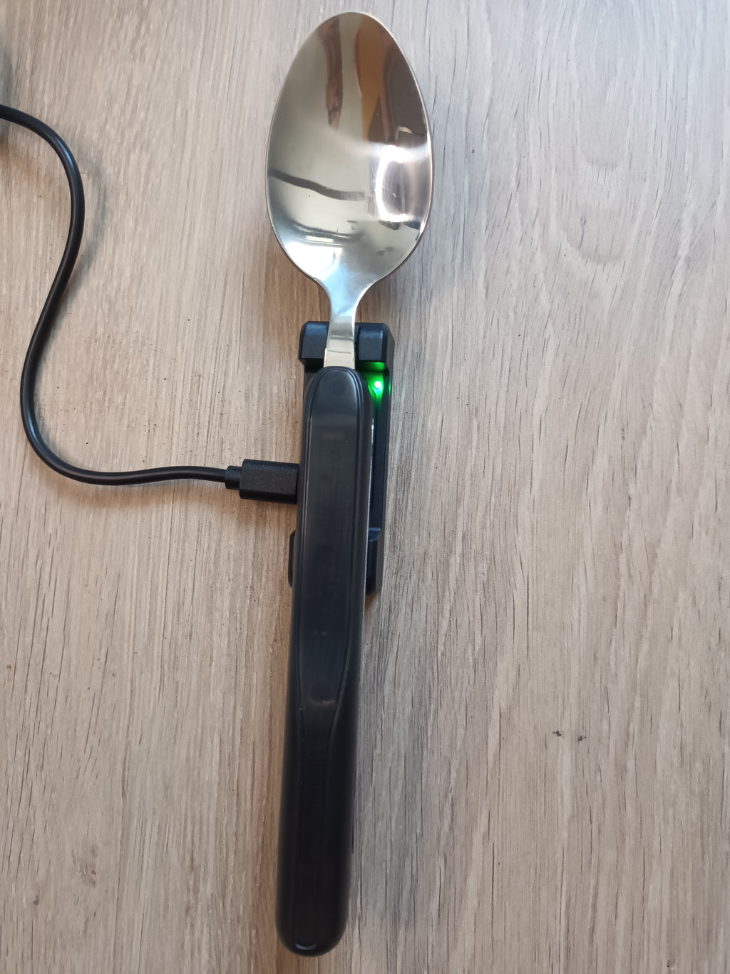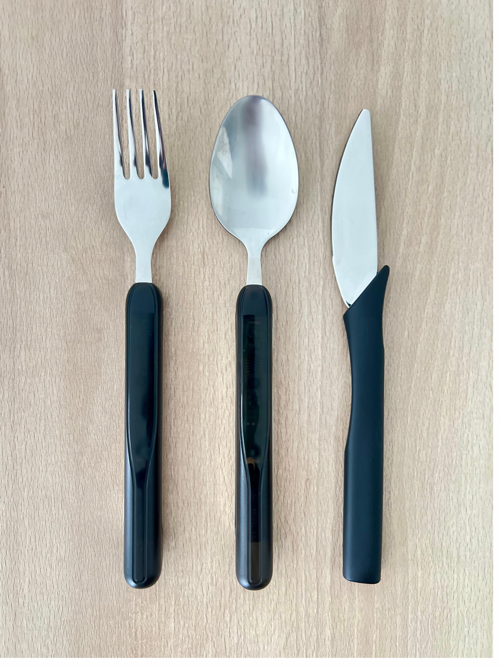 The cutlery pack contains a smart fork, matching knife, a smart spoon and a charger (equipped with batteries). The fork and spoon can be recharged on the charger. They don't take up much space, which makes them perfect for travelling.