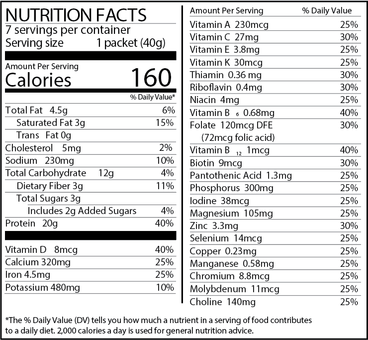 Vitamins and Minerals: Dipotassium Phosphate, Milk Calcium Complex, Choline Bitartrate, Potassium Bicarbonate, Magnesium Oxide, Ascorbic Acid, Ferrous Sulfate, Zinc Sulfate, Alpha Tocopherol Acetate, Niacinamide, Manganese Sulfate, Copper Gluconate, D-Calcium Pantothenate, Pyridoxine Hydrochloride, Vitamin A Palmitate, Riboflavin, Thiamin Mononitrate, Folic Acid, Chromium Polynicotinate, Molybdenum Glycinate Chelate, Potassium Iodide, L-Selenomethionine, Phytonadione, Menaquinone 7, Biotin, Cholecalciferol, Magnesium Carbonate, Cyanocobalamin.