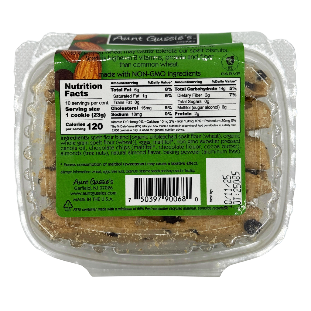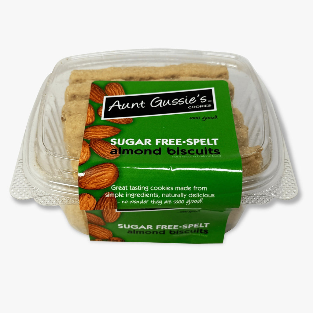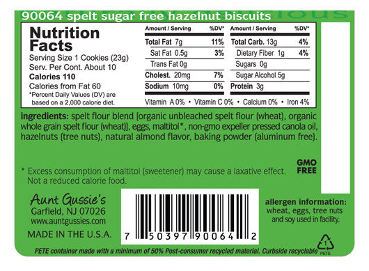 SugarAunt Gussie's Sugar Free Spelt Biscuits are made with organic Spelt flour and protein rich nuts. Spelt is an ancient grain that has a rich, nutty flavor. It is a superb source of fiber with high water solubility, allowing its nutrients to be more easily absorbed than common wheat. Aunt Gussie's Sugar Free Spelt Biscuits are crisp, sugar free, and sweetened with maltitol.