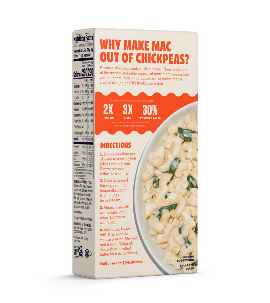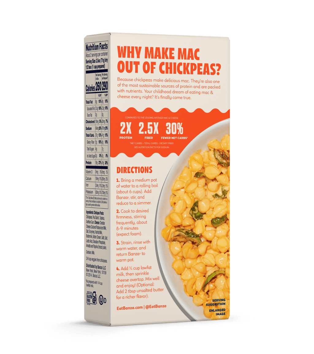 Banza Chickpea Pasta Mac & Cheese is comfort food you can feel good about. Banza took gluten free pasta made from chickpeas and added loads of yummy, cheesy goodness. With 2 times the protein, 4 times the fiber, and fewer net carbs than regular mac and cheese, Banza Chickpea Pasta Mac and Cheese is sure to please every member of your family.