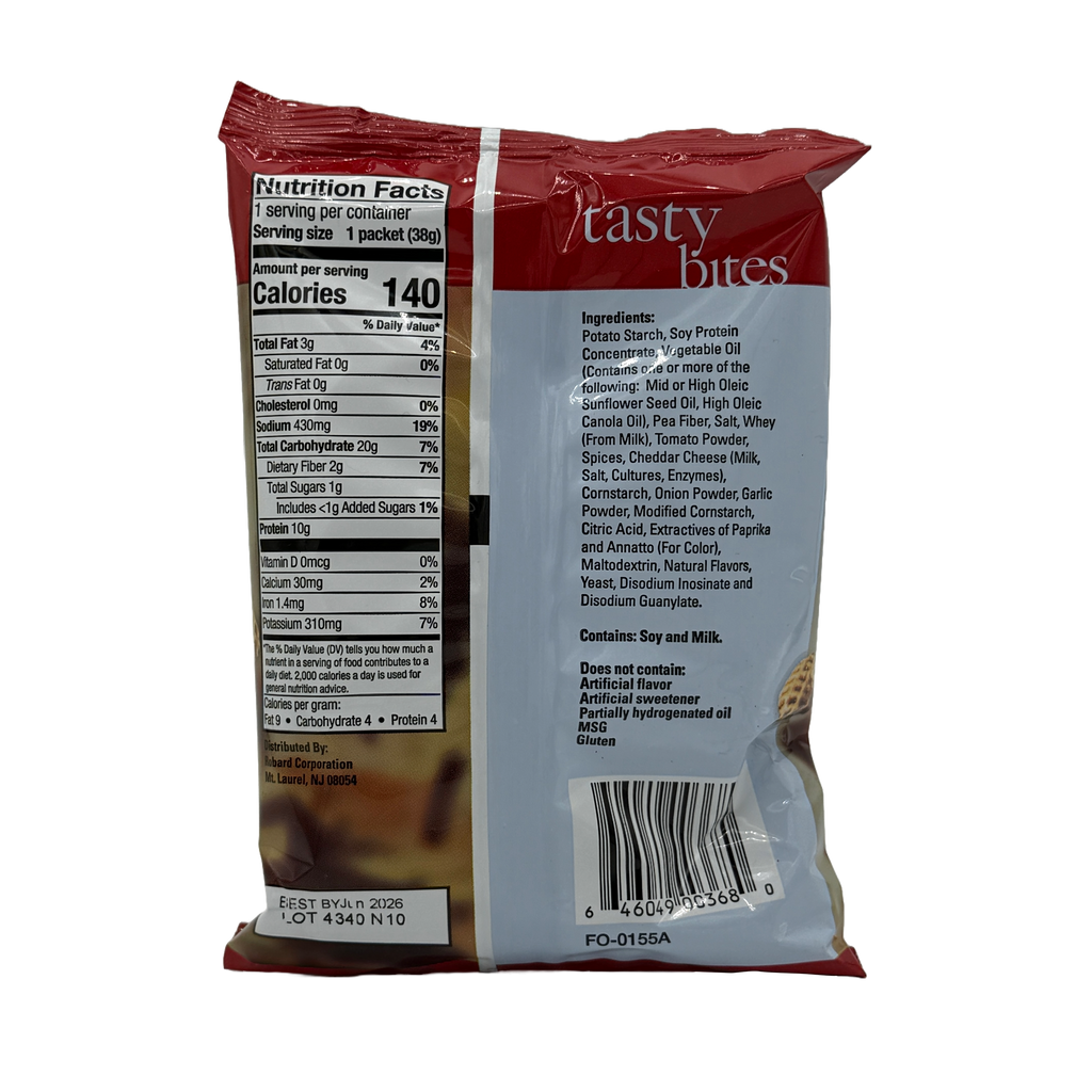 Ingredients: Potato Starch, Soy Protein Concentrate, Vegetable Oil (Contains one of more of the following: Mid or High Oleic Sunflower Seed Oil, High Oleic Canola Oil), Pea Fiber, Salt, Whey (From Milk), Tomato Powder, Spices, Cheddar Cheese (Milk, Salt, Cultures, Enzymes), Cornstarch, Onion Powder, Garlic Powder, Modified Cornstarch, Citric Acid, Extractives of Paprika and Annatto (For Color), Maltodextrin, Natural Flavors, Yeast, Disodium Inosinate and Disodium Guanylate.