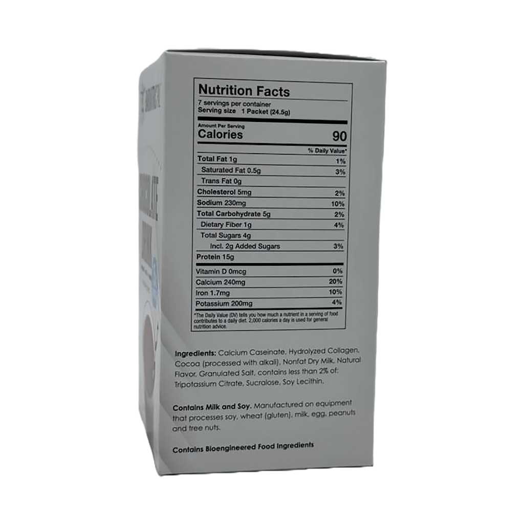 Ingredients: Calcium Caseinate, Hydrolyzed Collagen, Non-Fat dry milk, Cocoa (processed with alkali), Natural Flavor, Granulated Salt, contains less than 2% of: Tripotassium Citrate, Sucralose, Soy Lecithin.