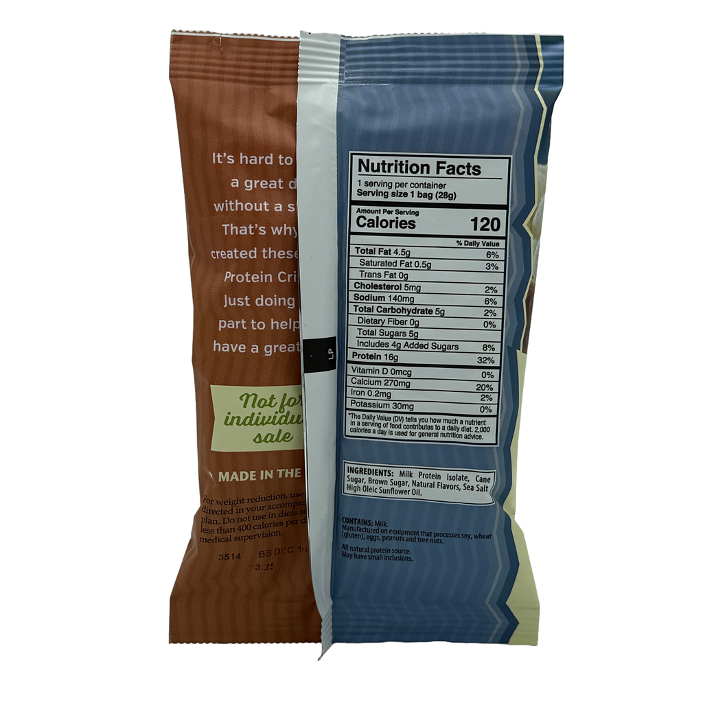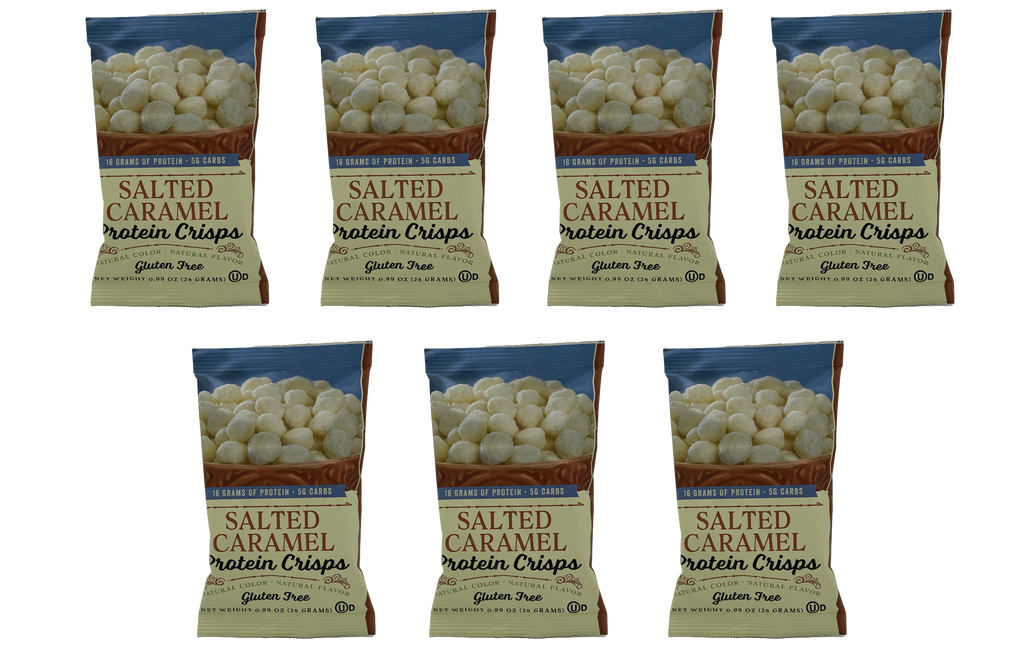 BariatricPal Protein Crisps - Salted Caramel taste like rich, sweet caramel tempered with real sea salt. They are ready to eat for a snack on their own, or you can turn them into a meal by mixing them into cottage cheese or yogurt. You can even crush them and use them to top a fruit salad. Each box contains 7 single-serving bags that you can stash in a gym bag, at work, in the car, and at home.