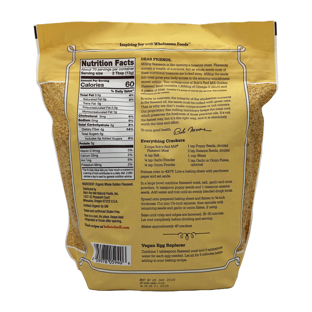 Bob's Red Mill Organic Golden Flaxseed Meal is ground on cool mills which both preserves the healthy oils and increases bioavailability of nutrients. Bob's Red Mill Organic Golden Flaxseed Meal has a very mild, nutty flavor. Sprinkle flaxseed over just about any dish to add omega-3 fatty acids and fiber to your food.