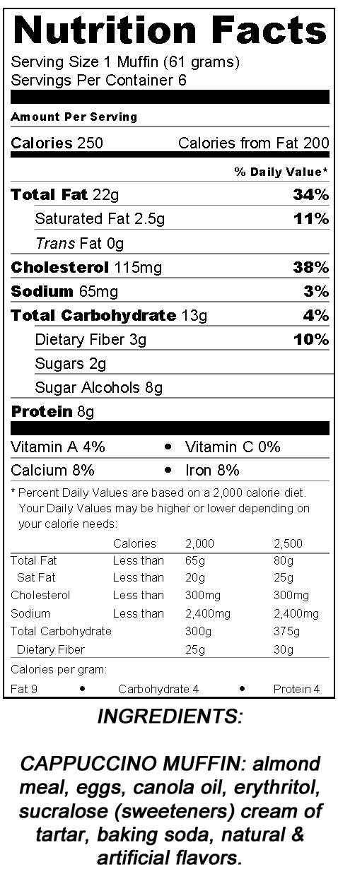 SugarCarbolicious Low Carb Ready-to-Eat Muffins are made with almond flour and sweetened with erythritol and sucralose. These low carb muffins contain no sugar or trans fats.