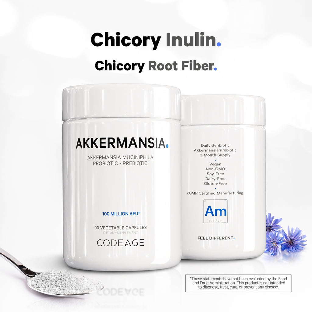 Codeage Akkermansia is a premium supplement formulated for gut health, GI barrier function, intestinal walls, and overall digestive wellness support.* It pairs akkermansia muciniphila with chicory inulin, a chicory root fiber, to offer probiotic, prebiotic, and synbiotic benefits.
