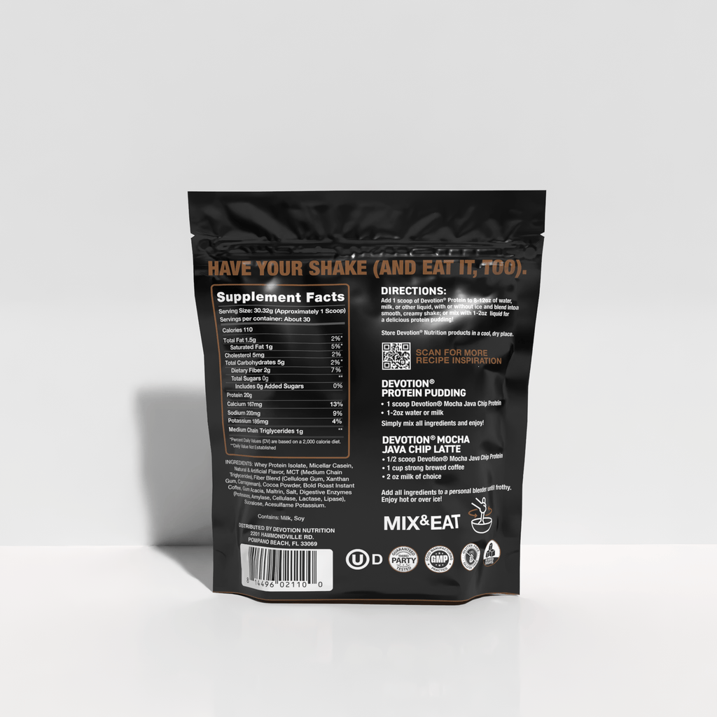 Made with a balanced formula of 80% isolated whey and 20% miscellar casein protein, Devotion Nutrition Original Protein Powder delivers sustained amino acids to your body in a rich, creamy, easy blending formula. Containing six important digestive enzymes and a full gram of MCT (medium chain triglycerides), Devotion Protein Powder is easy on the stomach with no bloating, and no sugar to interfere with maximizing your potential. Enjoy it as a quick drink, an instant ice cream, or in baking. Devotion's unique formula is specifically designed to keep your high protein pancakes, waffles and baked snacks moist and smooth.