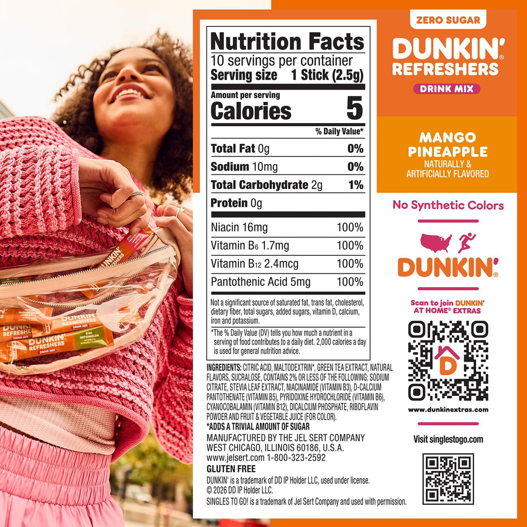 Same Dunkin’ taste you love now in a drink mix that moves with you. Dunkin’ Refreshers Drink Mix is fueled with energy from green tea and B vitamins to help you power through the day no matter how you run. Zero sugar, Sweetened with stevia and sucralose, low in calorie and gluten free in every sip. Try a whole new way to take Dunkin’ Refreshers with you for flavor and function that turns everyday water into something fun, refreshing and distinctly Dunkin’.