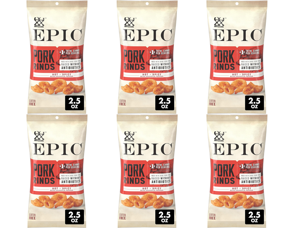 EPIC Hot + Spicy Pork Rinds bring the heat to this crunchy favorite in the EPIC lineup. These pork skins come with a kick of Red Pepper and Chipotle Pepper Powder; and are the carb-conscious snack for the heat-seeking crowd. Looking for more? Swap out chips for next level nachos or spice up a bowl of chili with a topping of Hot + Spicy Pork Rinds.