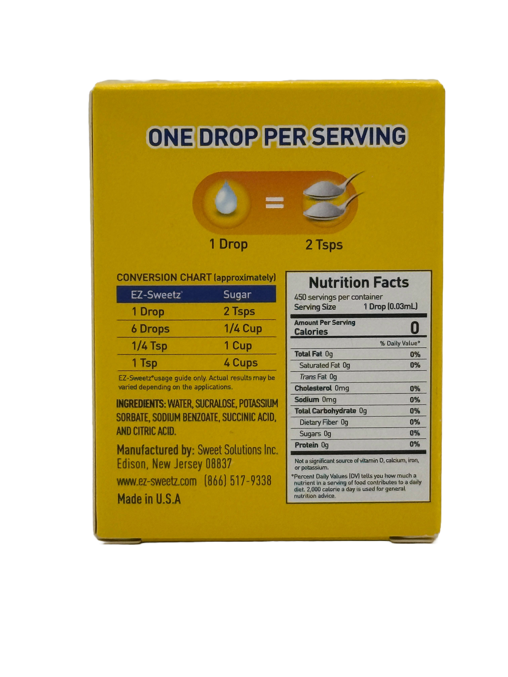EZ-Sweetz Liquid Sucralose is a zero calorie, zero carb concentrated sweetener. Sucralose is the generic name of the sweetener being sold as Splenda. EZ-Sweetz tastes like sugar, is convenient to use, and easy to store. EZ -Sweetz is a sugar substitute that has no after taste. Since liquid sucralose is very stable when exposed to high temperatures, EZ-Sweetz can be used where ever sugar is used, including cold and hot beverages, bakery, and general home cooking purposes.