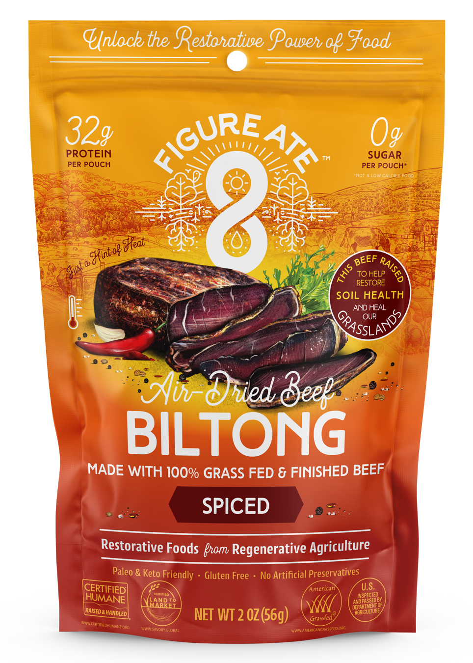 Experience the taste of our award-winning South African style Beef Biltong: crafted from 100% regeneratively sourced, grass-fed, and finished beef, marinated in Figure Ate signature Persimmon Vinegar and a blend of coriander, peppers, and garlic, then air-dried for unrivaled freshness and a subtle spiced flavor