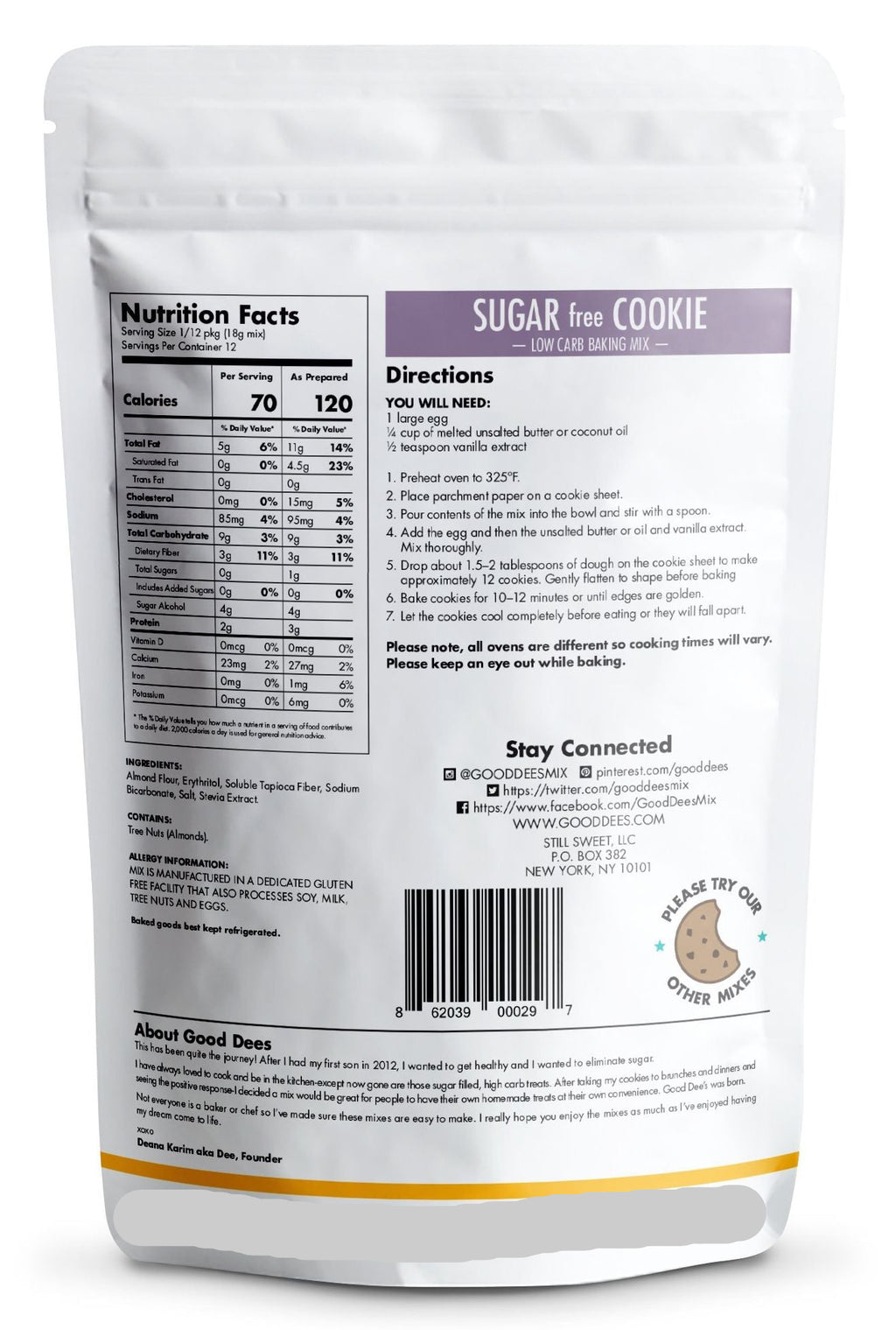 Good Dee's Low Carb Sugar(free) Cookie Baking Mix is made with almond flour and sweetened with Erythritol. This mix is perfect for anyone with a gluten sensitivity and for those watching their sugar intake. Just add egg, melted butter, and vanilla extract. In minutes you'll have gooey, buttery, low carb sugar cookies. With Good Dee's Low Carb Sugar(free) Cookie Baking Mix, you'll enjoy guilt-free sugar cookies with zero sugars and only 2 net carbs per serving.