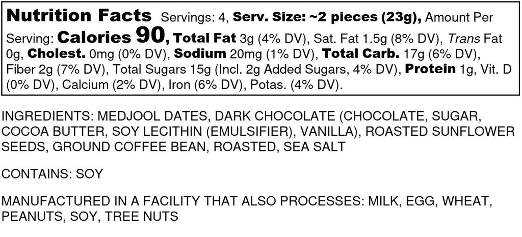 Coffee Dates: Dark chocolate-coated Medjool dates filled with sunflower butter + espresso. Casual, exciting, & energizing. Feels like a hug from an old friend.