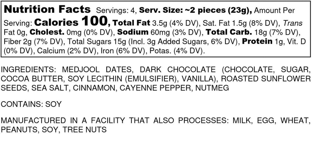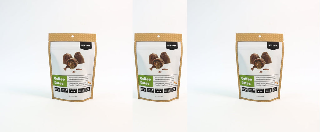Hot Dates: Dark chocolate-coated Medjool dates filled with spiced sunflower butter with a touch of sea salt. Sweet, salty, and just enough heat to keep you coming back for more.