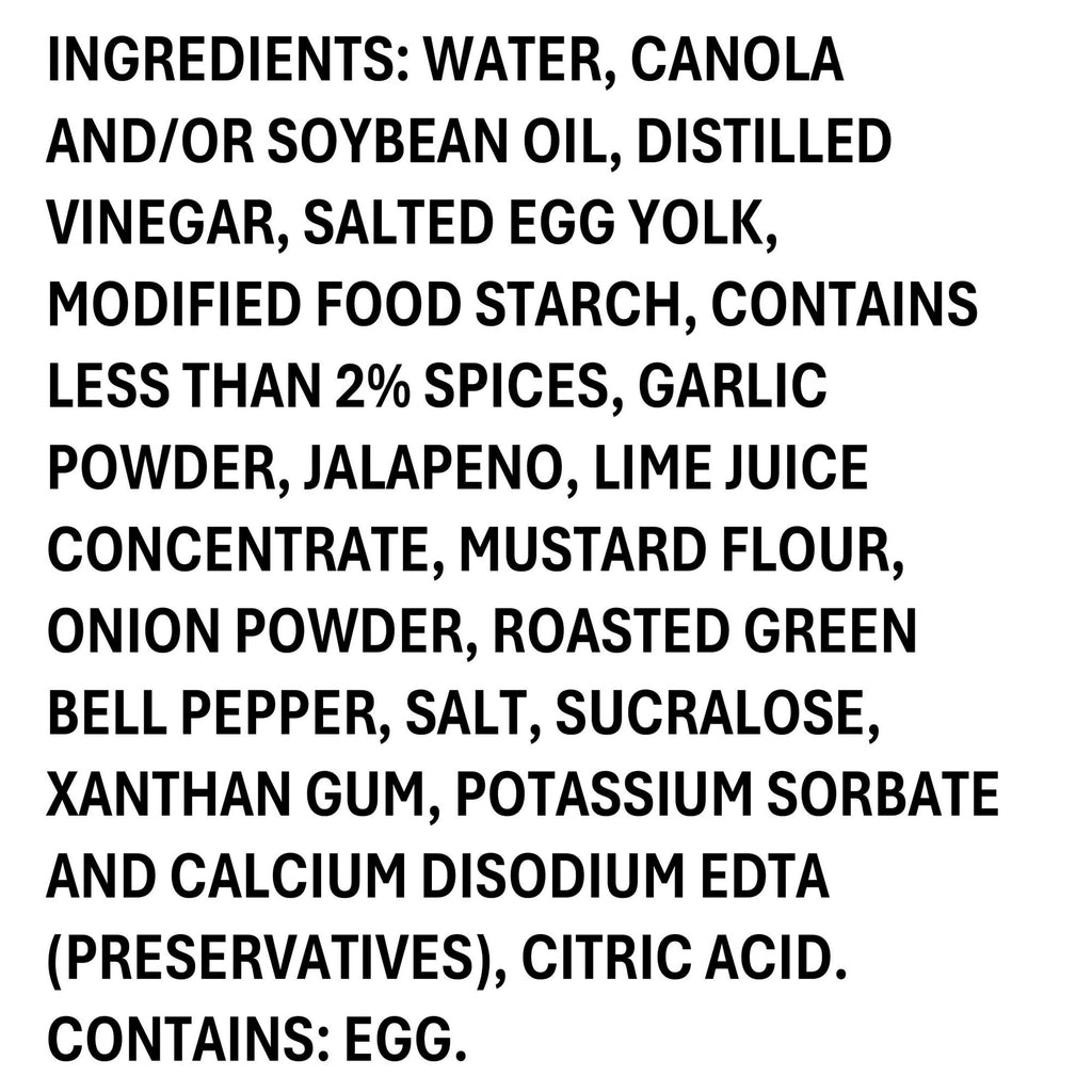 - Yum Yum - Water, Canola Oil, Salted Egg Yolk, Sriracha Sauce (Chili Peppers, Sorbitol, Vinegar, Salt, Garlic, Xanthan Gum, Beet Powder, Natural Flavor), Tomato Paste, Vinegar, Contains 2% or less of Cider Vinegar, Salt, Modified Food Starch, Mustard Flour, Lemon Juice Concentrate*, Spice, Garlic Powder, Onion Powder, Paprika Extractive (Color), Xanthan Gum, Sucralose, Potassium Sorbate, and Calcium Disodium, EDTA (To Preserve Freshness). CONTAINS: EGG