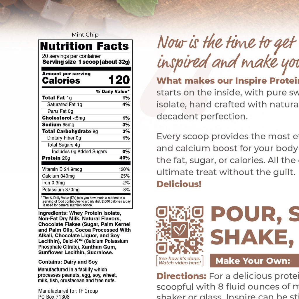 Inspire Mint Chip melts into a protein drink that tastes like Vanilla Peppermint Stick with light flakes of Milk Chocolate that come floating through to melt on the tongue. We start with pure sweet clean whey protein isolate so the natural flavors shine. You won't believe this is protein. Inspire is made for the bariatric pouch - a small thin smooth drink you blend in a glass using just a spoon.