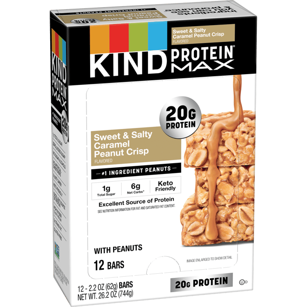 Looking for a snack that is an excellent source of protein, high fiber, and keto friendly? Introducing KIND Protein MAX Snack Bars. Protein Max bars are individually wrapped, gluten free, and contain 20g of protein, 0g added sugar*, and 1g of total sugar.