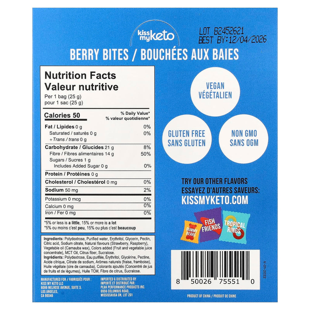 Kiss My Keto Keto Berry Bites gummy is a specialist keto food with a high fat and high fiber content. To avoid discomfort, please limit consumption to 1 bag (25g) per day.
