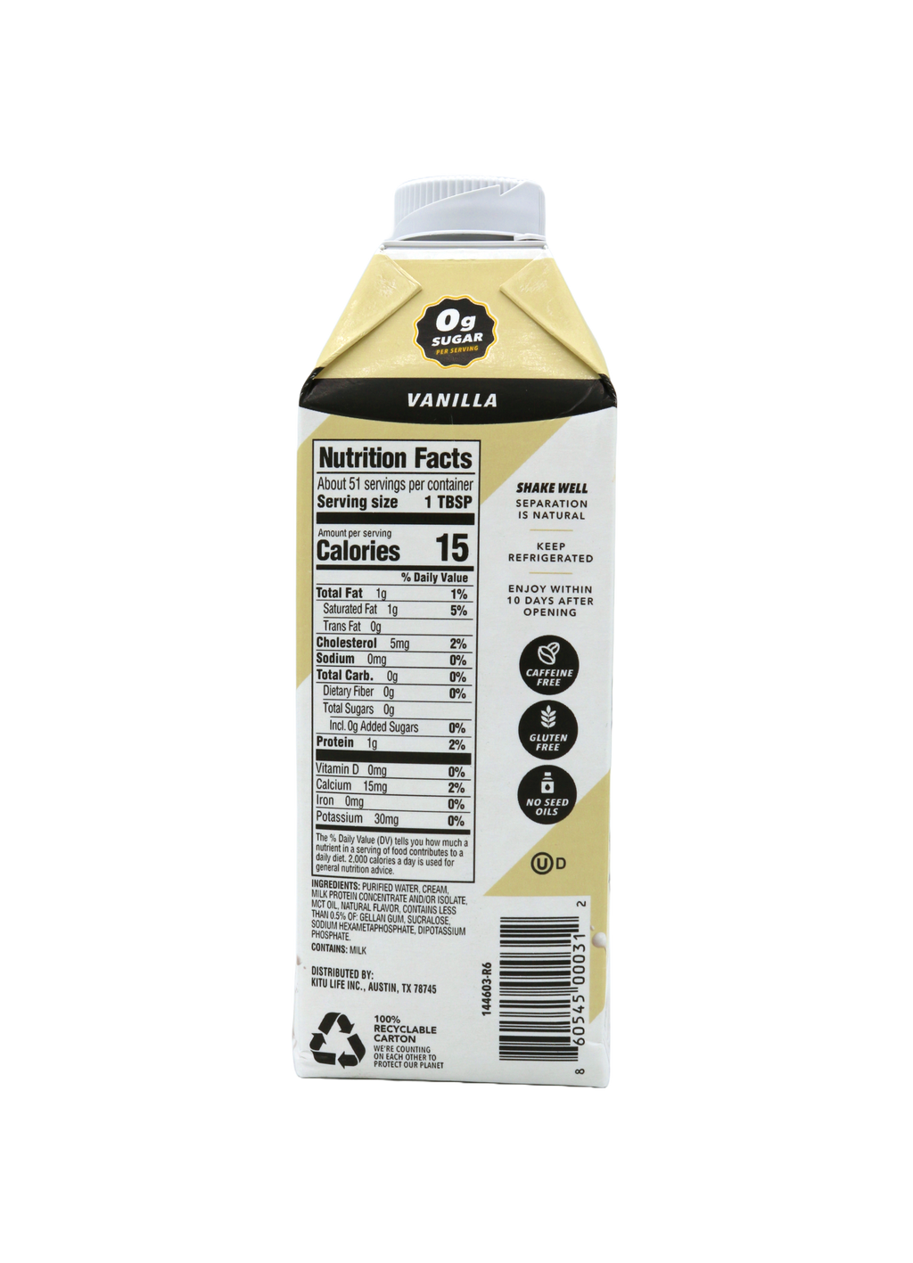 Kitu Super Creamer is the perfect match for your bold cup of coffee. With zero sugar, MCT oil (fats) and protein, Kitu Super Creamer is a low carb, keto friendly creamer you'll love. Kitu Super Creamer contains no gluten, no carrageenan, and no sugar alcohols. Refrigerate after opening and use within 10 days.