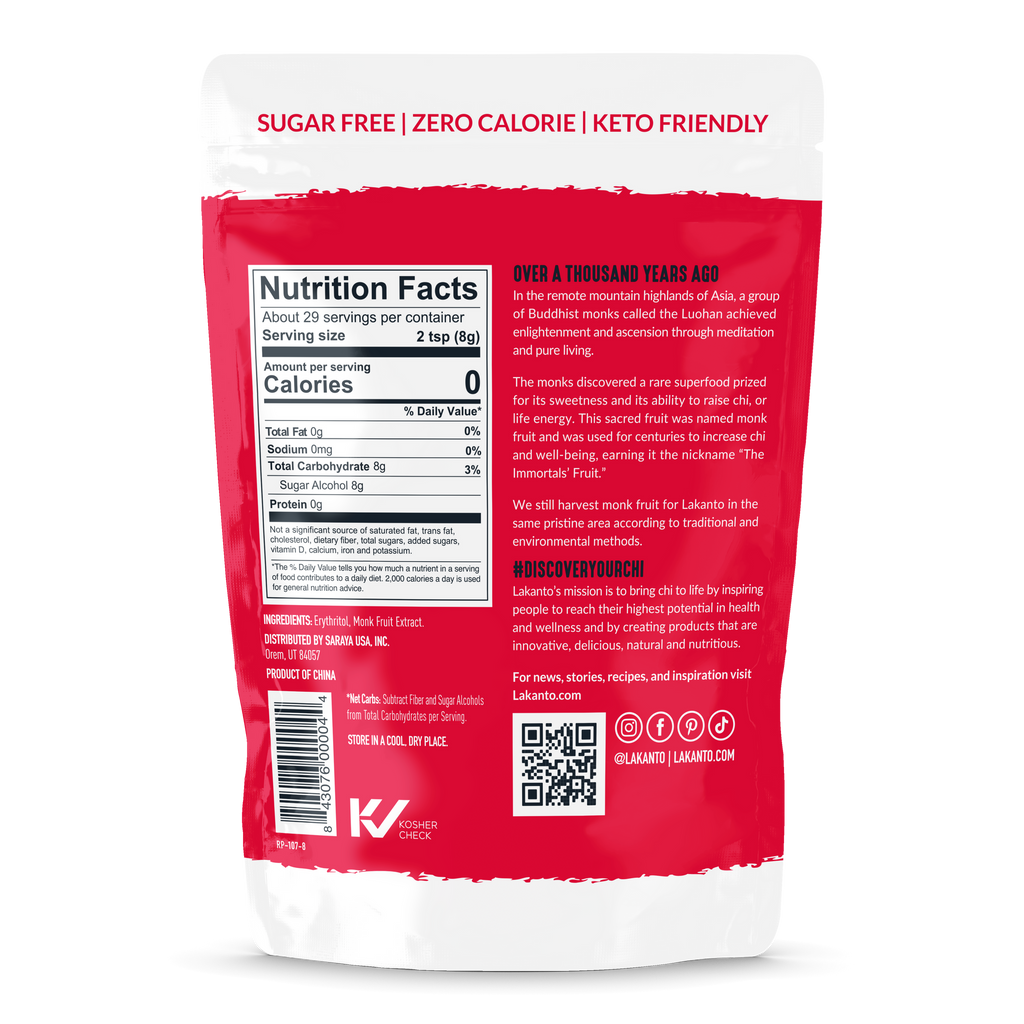 SugarLakanto Monk Fruit Sweetener is zero calories, zero glycemic sweetener that is just like white sugar.