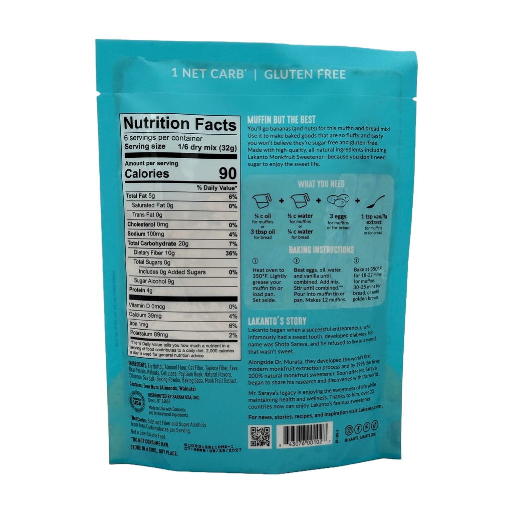 Lakanto Sugar Free Muffin & Bread Mix is a low carb baking mix that's sweetened with Lakanto's Monk Fruit Sweetener, a blend of monk fruit and erythritol. Imagine warm, fluffy, low carb, gluten free muffins and bread fresh out of the oven. Just add eggs, coconut oil, and water to Lakanto Sugar Free Muffin & Bread Mix.