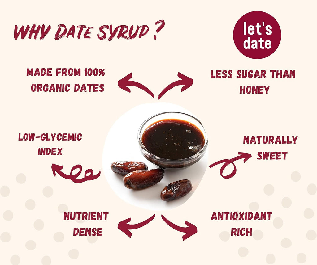 Every sweet, delicious & glistening drop is filled with essential nutrients. Use it in your coffee or tea, as a topping for ice cream, yogurt, or fruit, as a gooey center for baked goods, or a sweet gravy for biscuits! With Let's Date Organic Date Syrup, you can add a little healthy natural sweetness to your life—and toss the refined sugar. Do something different for breakfast. Let's Date!