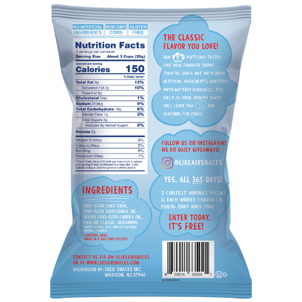 Enjoy a guilt-free snack that’s both delicious and clean. Like Air Puffcorn delivers a melt-in-your-mouth lightness that tastes indulgent but fits seamlessly into healthy lifestyles. Crafted with non-GMO cornmeal and no artificial ingredients, flavors, or preservatives, this snack gives you the satisfaction of popcorn—without the hulls, kernels, or heaviness.