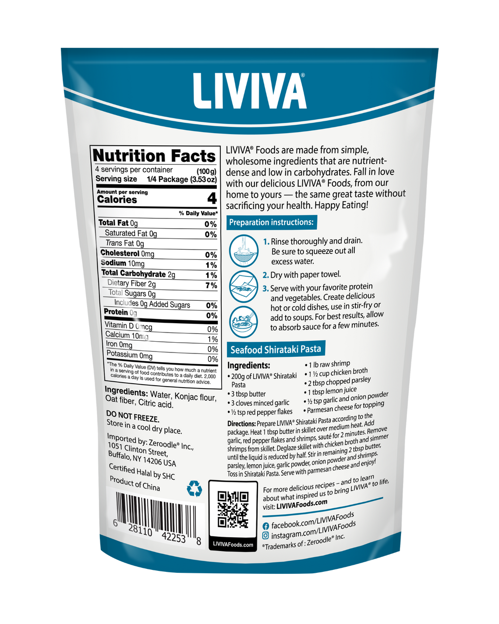 SugarLIVIVA Organic Shirataki Fettuccine with Oat Fiber made from organic konjac root is a superfood packed with all the right nutrients for your healthy lifestyle. Containing just 15 calories, zero sugar, and zero fat per serving makes this the perfect pasta alternative for your next meal.