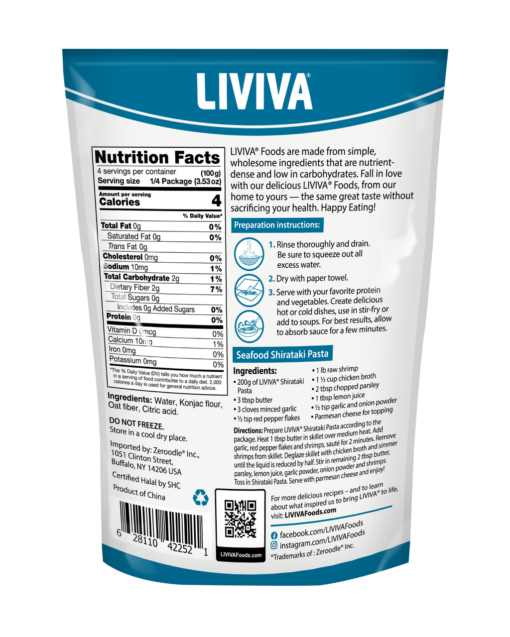 SugarLIVIVA Organic Rice Shaped Shirataki with Oat Fiber is the superfood you’ve been looking for – but didn’t know existed. Made with organic konjac root, this pasta has just 15 calories, zero sugar, and zero fat per serving. Artisan-crafted using only all-natural ingredients with no additives or preservatives, LIVIVA Organic Rice Shaped Shirataki with Oat Fiber can be used like any other pasta!