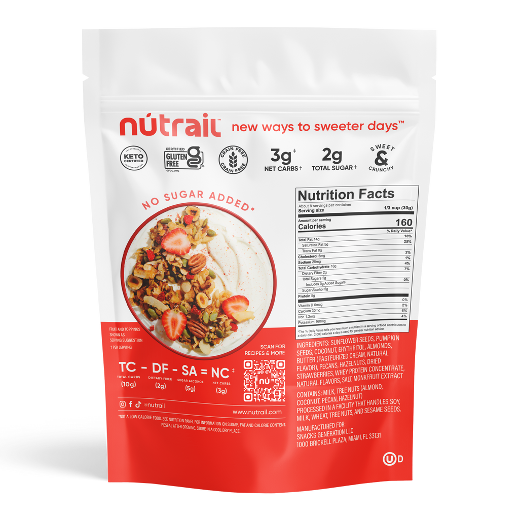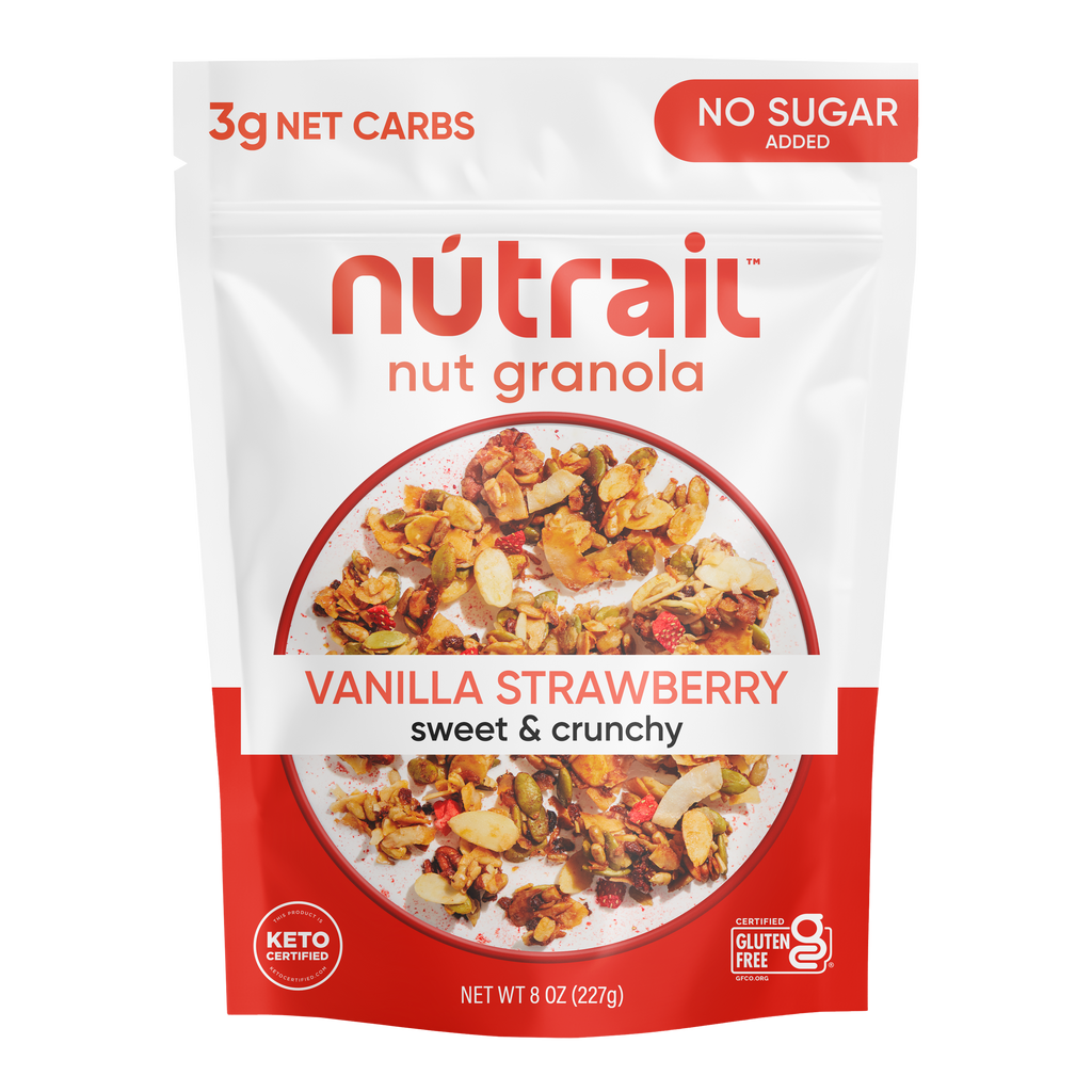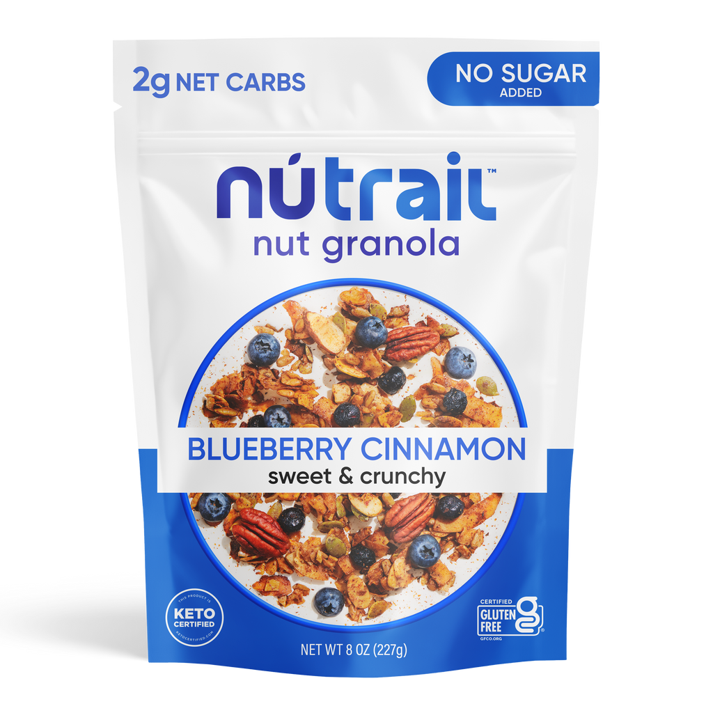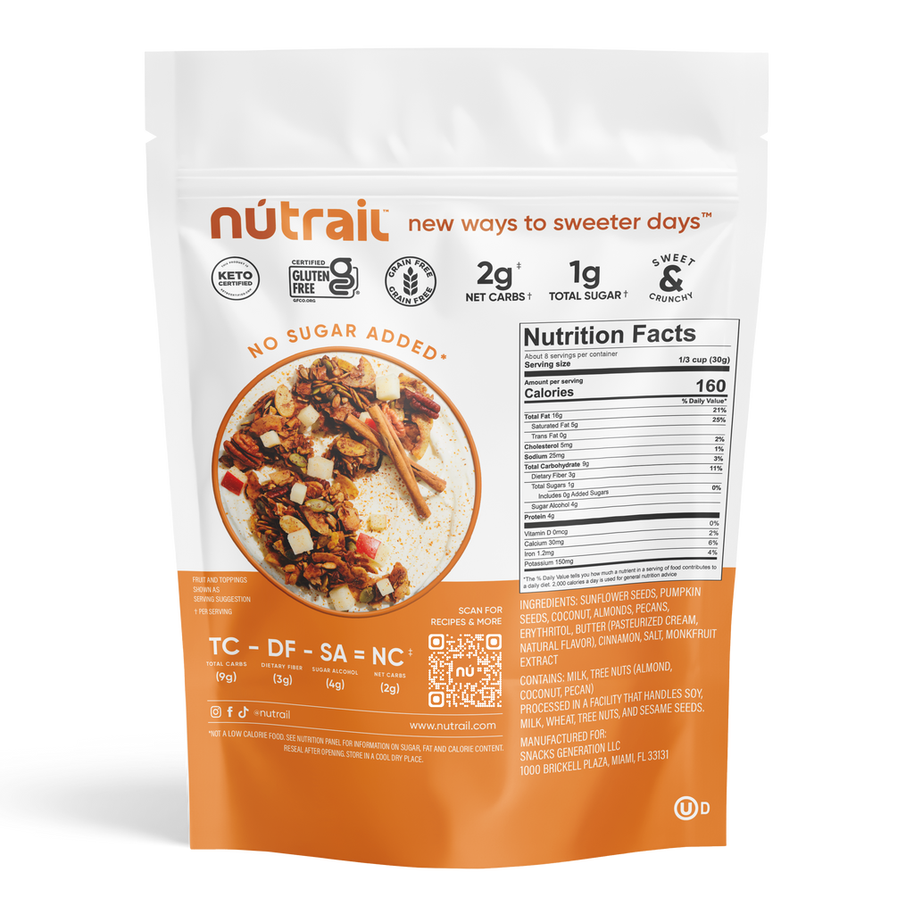 NuTrail / Low Karb Keto Nut Granola combines a delicious blend of nuts, seeds, and flavors that will fill you up and give you a boost of energy. NuTrail / Low Karb Keto Nut Granola is the perfect low carb snack right out of the bag, or pour your favorite nut milk over it for a wonderful low carb, keto cereal. Also great as a topping for desserts. Keto Nut Granola is sweetened with erythritol and monk fruit.