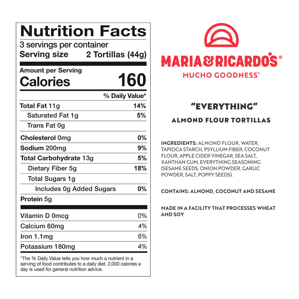 Maria and Ricardo's Almond Flour Keto Tortillas are a low carb, gluten free tortilla that's made with the highest quality, non-GMO ingredients to give you a taste and texture you'll love. Maria and Ricardo's Almond Flour Keto Tortillas are oven-baked and made from scratch using simple, wholesome ingredients, bringing the goodness of real Mexican cuisine to every package. Maria and Ricardo's Almond Flour Keto Tortillas contain no artificial flavors, colors or preservatives.