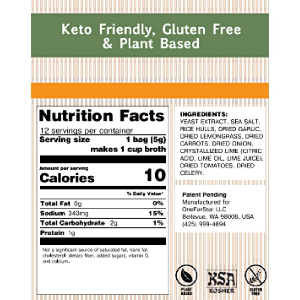 Ingredients: organic vegetable blend (carrots, celery, onion), sea salt, yeast extract, garlic, lemongrass, lime, green tea, herbs & spices