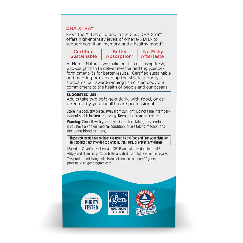 Nordic Naturals DHA Xtra is a potent DHA formula for intensive cognitive support. DHA Xtra packs almost 1000 mg of pure omega-3 DHA into a single serving. Made from 100% wild-caught sardines and anchovies, Nordic Naturals DHA Xtra softgels have a delicious natural strawberry flavor, and are perfect for anyone needing high-intensity brain and mood support. DHA helps maintain cellular fluidity, and supports normal memory, cognition, emotional well-being, and vision.