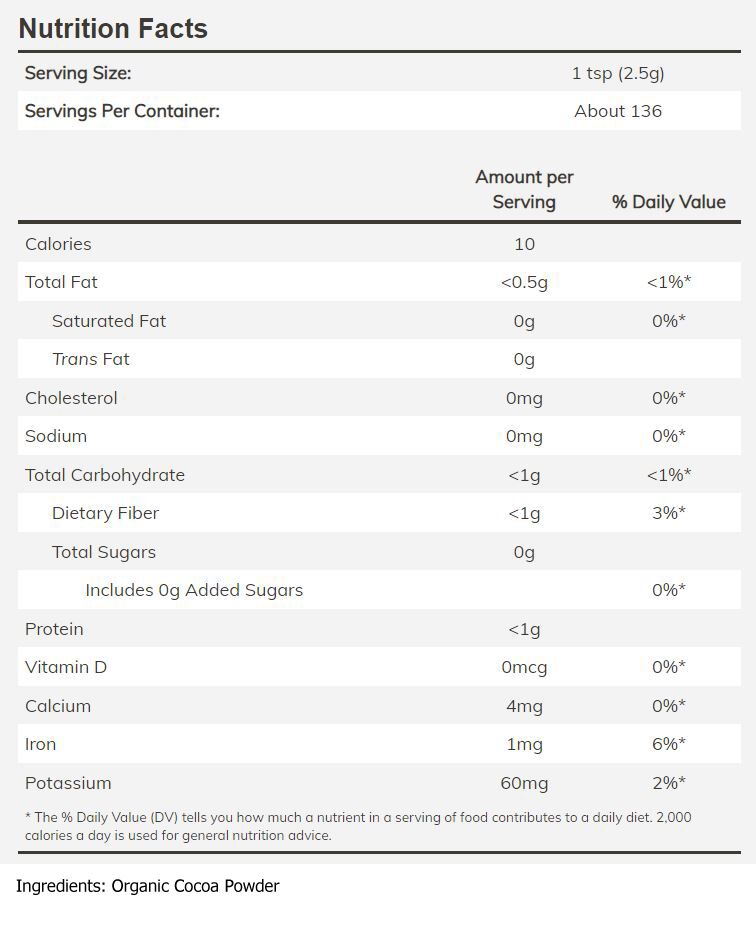 SugarNOW Organic Cocoa Powder is perfect for mouth-watering desserts to steaming cups of hot chocolate. Now Cocoa Lovers Organic Cocoa Powder is a guilt-free way to satisfy your sweet tooth without the sugar, fat, and preservatives commonly found in other brands. NOW Organic Cocoa Powder has no sugar and is non-alkalized.