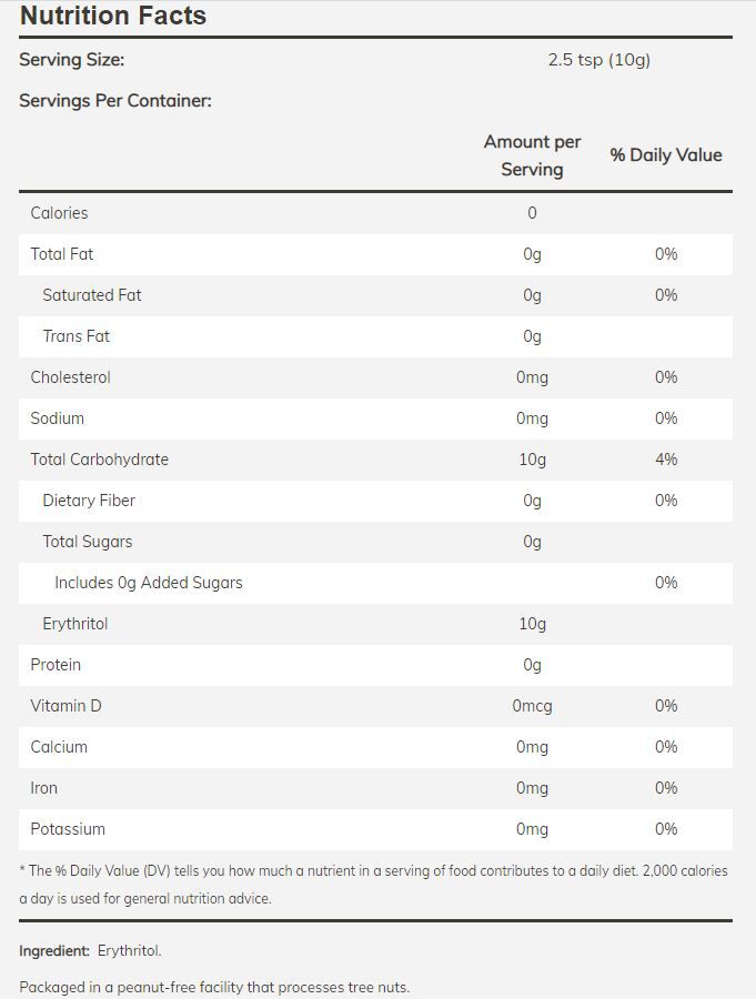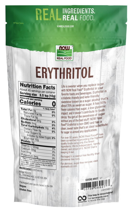 NOW Erythritol is a pleasant tasting natural sweetener that can be used in place of regular sugar in all of your favorite foods and beverages (hot and cold). Granulated Erythritol has zero calories and zero net carbs, and is a keto-friendly sweetener. Known as a sugar alcohol, Erythritol is about 70% as sweet as refined sugar. NOW Erythritol is an ideal sugar substitute. 1 1/3 cups Erythritol will give the equivalent sweetness of 1 cup of sugar.
