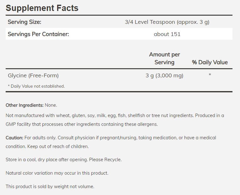 NOW Glycine is a Pharmaceutical Grade supplement that promotes restful sleep and supports the nervous system. Glycine is the smallest and simplest amino acid, making it versatile for use in a wide range of functions. Glycine is necessary for the production of glutathione, DNA, creatine, bile, hemoglobin, and most proteins.* Glycine also helps to promote glycogen storage, thereby making glucose readily available for energy production.* Glycine functions as a calming neurotransmitter in the brain, where it facilitates nerve impulses and is important for the maintenance of healthy sleep patterns.*.