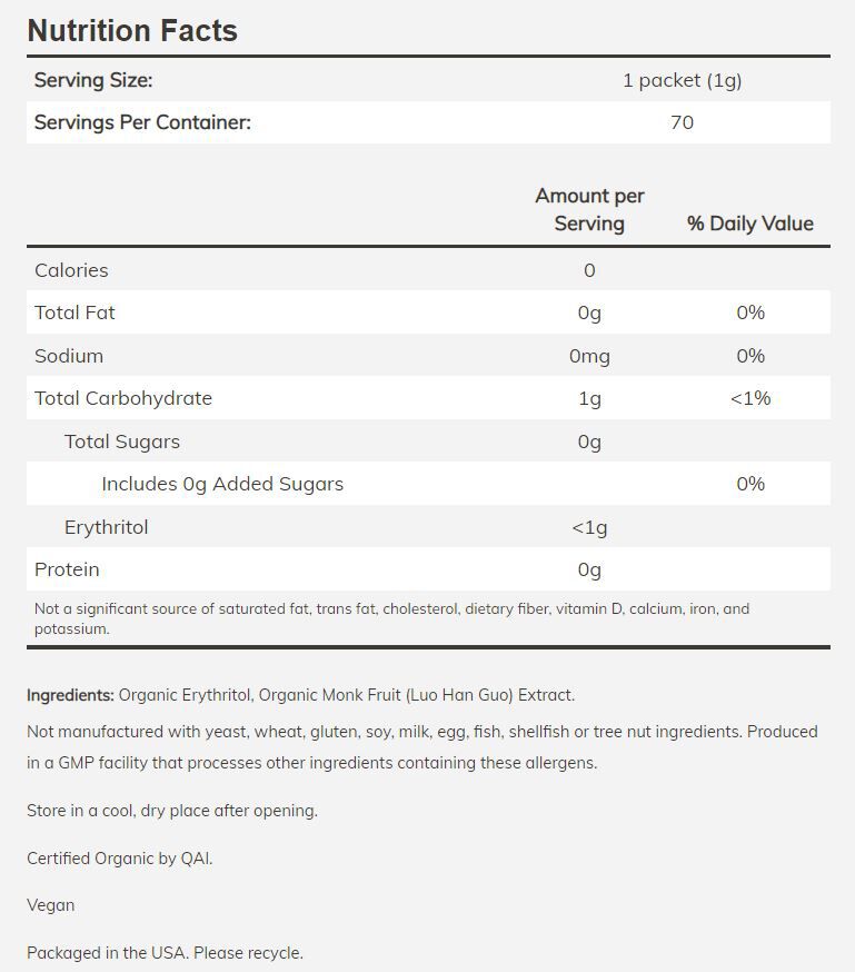 NOW Organic Monk Fruit Packets are a 0 calorie, 0 net carb, sugar alternative that fits your low carb, keto lifestyle. This low carb sweetener is deliciously sweet without any bitter aftertaste. Free of oligosaccharides and other additives, NOW Organic Monk Fruit Packets are just right for sweetening coffee, tea, yogurt, oatmeal and smoothies.