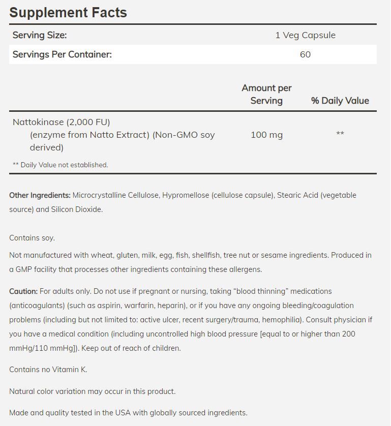 NOW Nattokinase helps maintain normal blood flow.* Nattokinase is an enzyme isolated from natto, a traditional Japanese fermented soy food. Natto has been consumed for thousands of years for its numerous health promoting properties. More recently, both clinical and non-clinical studies have demonstrated that nattokinase can help to promote heart and circulatory health by supporting normal blood clotting functions.* NOW Nattokinase is derived from non-GMO soy and has 2,000 FUs (Fibrinolytic Units) per 100 mg serving.