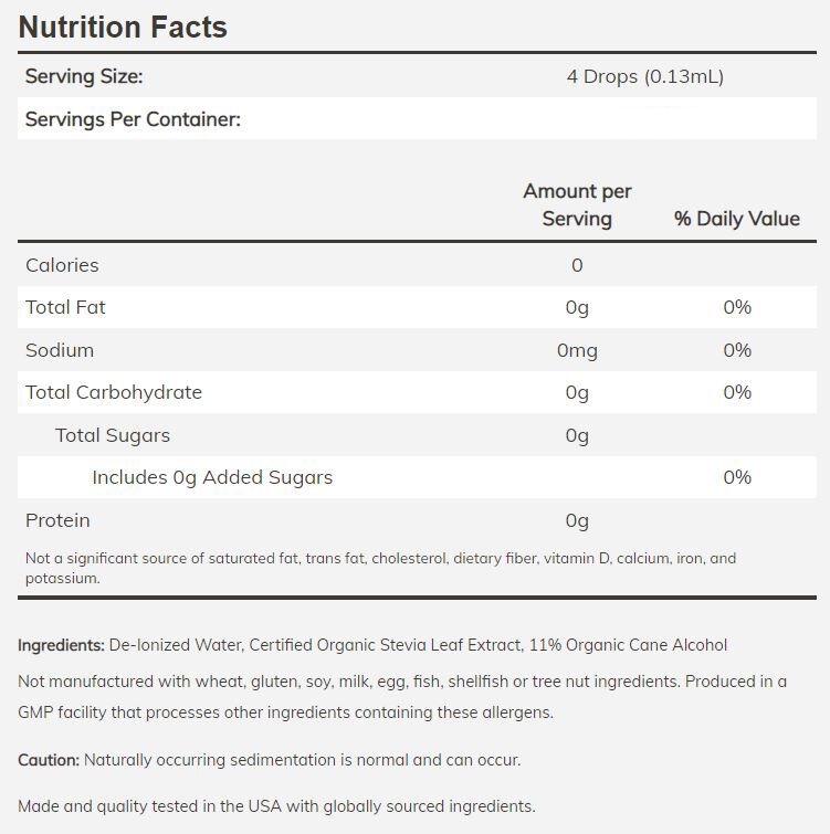 NOW Better Stevia Zero Calorie Liquid Sweetener is a zero calorie sweetener made with certified organic stevia extract and natural flavors. This low carb, sugar free sugar substitute can be used in beverages and foods. Sweeten to taste using 1 to 8 drops of NOW Better Stevia Zero Calorie Liquid Sweetener.