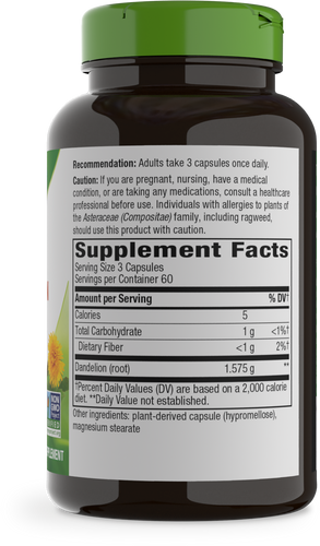 CarbsNature's Way Dandelion Root is a dietary supplement that acts as a diuretic to help the body get rid of extra fluid and salt.* Dandelion is a versatile botanical as the entire plant can be used for everything from herbal teas to salads and even wines. This pretty yellow flower that some consider a weed has been used for thousands of years. In traditional Native American cultures, the plant was boiled down into a tea. Dandelion Root is a traditional diuretic herb inspired by centuries of traditional wellness practices.