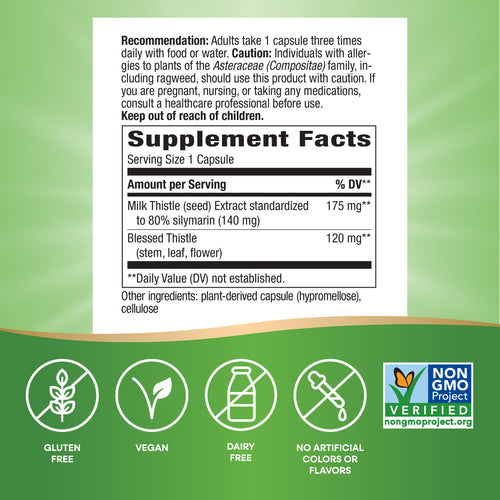 Nature's Way Milk Thistle is a dietary supplement that supports liver function. Your liver is an important organ as it filters blood, secretes bile, and neutralizes toxins. It can also enable your body to produce proteins and energy, store key vitamins and minerals, maintain hormone balance, and help facilitate digestion. Milk Thistle contains a substance called silymarin that has been shown to support liver function. The plant itself has been used for over 2,000 years. Nature's Way Milk Thistle is standardized to ensure consistent levels of silymarin.