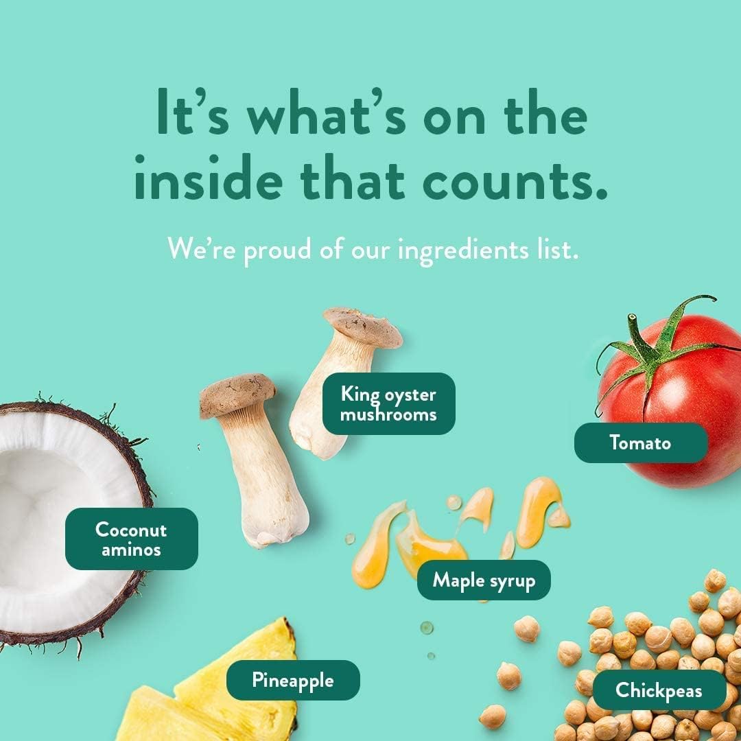 Ingredients: King Oyster Mushrooms, High Oleic Sunflower Oil, Maple Syrup, Water, Coconut Aminos* (Coconut Sap, Sea Salt), Toasted Sesame il, Chickpea Miso* (Rice Koji, Chickpeas, Sea Salt, Water), Tomato Paste, Bakers Yeast Extract, Orange Juice Concentrate, Gochugaru Flakes, Natural Hickory Smoke Flavor, Fermented Rice Extract, Ginger Powder, Garlic Powder, Onion Powder, Lactic Acid, Shiitake Powder, White Pepper, Rosemary Extract *Organic