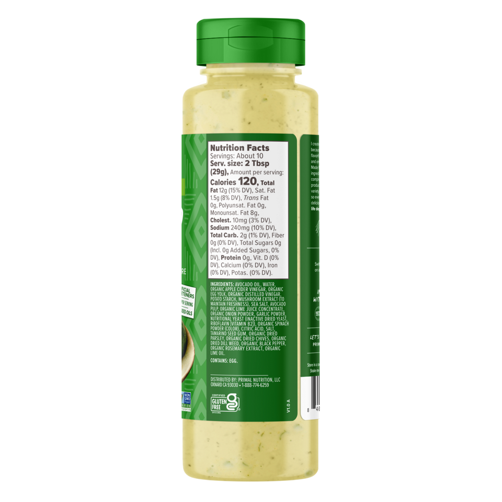 Ingredients: Avocado Oil, Water, Organic Apple Cider Vinegar, Organic Egg Yolk, Organic Distilled Vinegar, Potato Starch, Mushroom Extract (to maintain freshness), Sea Salt, Avocado Pulp, Organic Lime Juice Concentrate, Organic Onion Powder, Garlic Powder, Nutritional Yeast (Inactive Dried Yeast, Riboflavin [Vitamin B2]), Organic Spinach Powder (color), Citric Acid, Salt, Tamarind Seed Gum, Organic Dried Parsley, Organic Dried Chives, Organic Dried Dill Weed, Organic Black Pepper, Organic Rosemary Extract, Organic Lime Oil. Contains: Egg.