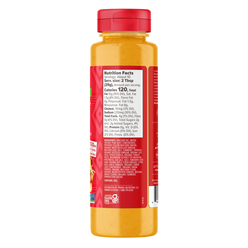 Ingredients: Avocado Oil, Water, Organic Pear Juice Concentrate, Prepared Yellow Mustard (Water, Organic White Distilled Vinegar, Mustard Seed, Salt, Turmeric, Paprika), Organic Distilled Vinegar, Organic Egg Yolk, Potato Starch, Organic Tomato Paste, Mushroom Extract (to maintain freshness), Sea Salt, Salt, Tamarind Seed Gum, Organic Apple Cider Vinegar, Citric Acid, Garlic Powder, Organic Lemon Juice Concentrate, Organic Onion Powder, Organic Mustard Flour, Organic Ancho Pepper Powder, Natural Smoke Flavor, Organic Turmeric Powder (for color). Contains: Egg.